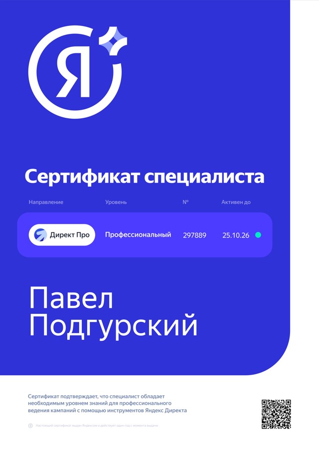 Являюсь сертифицированным специалистом по Яндекс и Google."